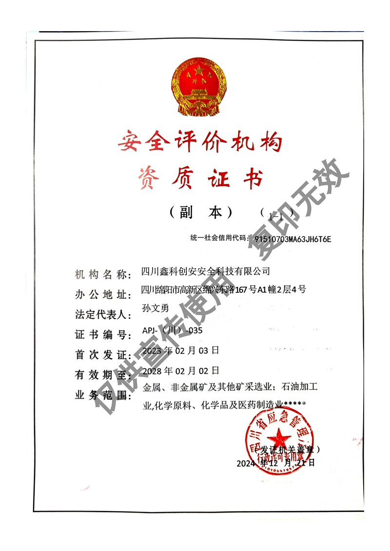 四川鑫科創(chuàng)安安全科技有限公司成立于2020年,是川北地區(qū)取得資質(zhì)的民營安全評價機構(gòu)(資質(zhì)證書編號:APJ-(川)-035)。并于2022年牽頭成立綜合應急救援隊伍 - 綿陽曙光應急救援中心。